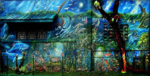 The wall is alive in three dimensions in make-believe perspective,progeny of primary colors - red, blue and yellow, bold and mellow,azure sky, deep blue-green sea, prism of every dewdrop bead,sparkle of every star at night, crystalline water Narcissus saw;if only walls can speak to mirror human longing of a happy world,if only man's wisdom can bring back Paradise lost a long time ago! ~